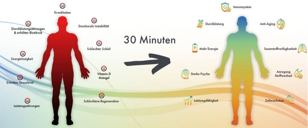 Ganzheitliches Wohlbefinden: Verbessere dein Körpergefühl, deine Vitalität, stärke dein Immunsystem und hebe deine Stimmung. Bringe deinen Tag-Wach-Rhythmus wieder ins Gleichgewicht.